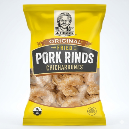 Chicharrones J. Higgs Original Fried Pork Rinds – Los clásicos chicharrones de cerdo fritos, crujientes y llenos de sabor. Elaborados con piel de cerdo frita hasta alcanzar una textura aireada y crocante. Son el snack perfecto para quienes buscan una opción baja en carbohidratos y alta en proteína, ideal para dietas cetogénicas o para acompañar tus comidas.